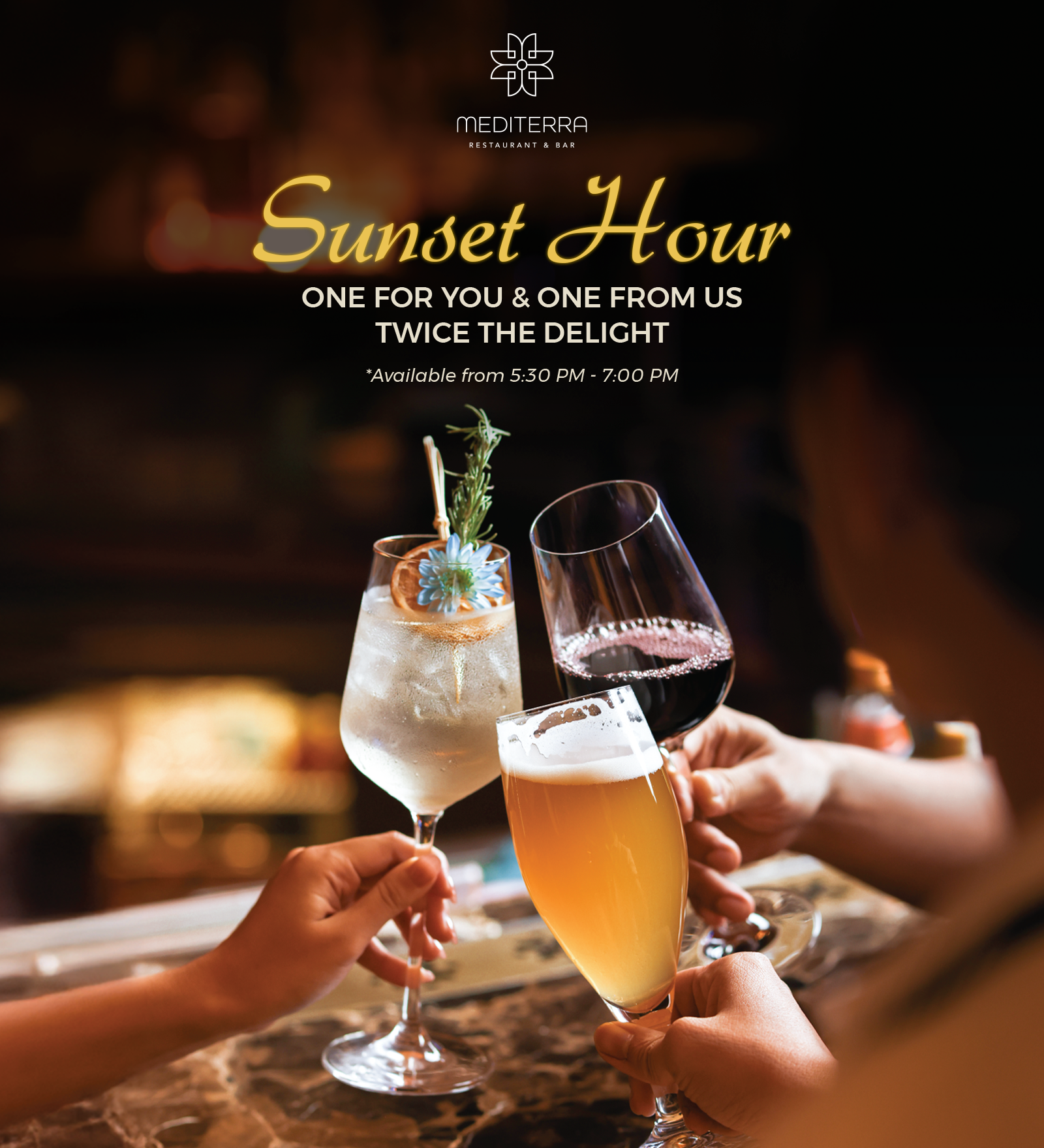 As daylight softens and the city slows, Mediterra Restaurant & Bar reveals its most inviting moment: Sunset Hour -